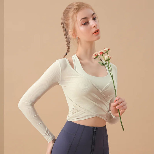 Slim Long Sleeve Yoga Women Cross T-shirt With Chest Pad Two Pieces Refreshing Comfortable Fit...