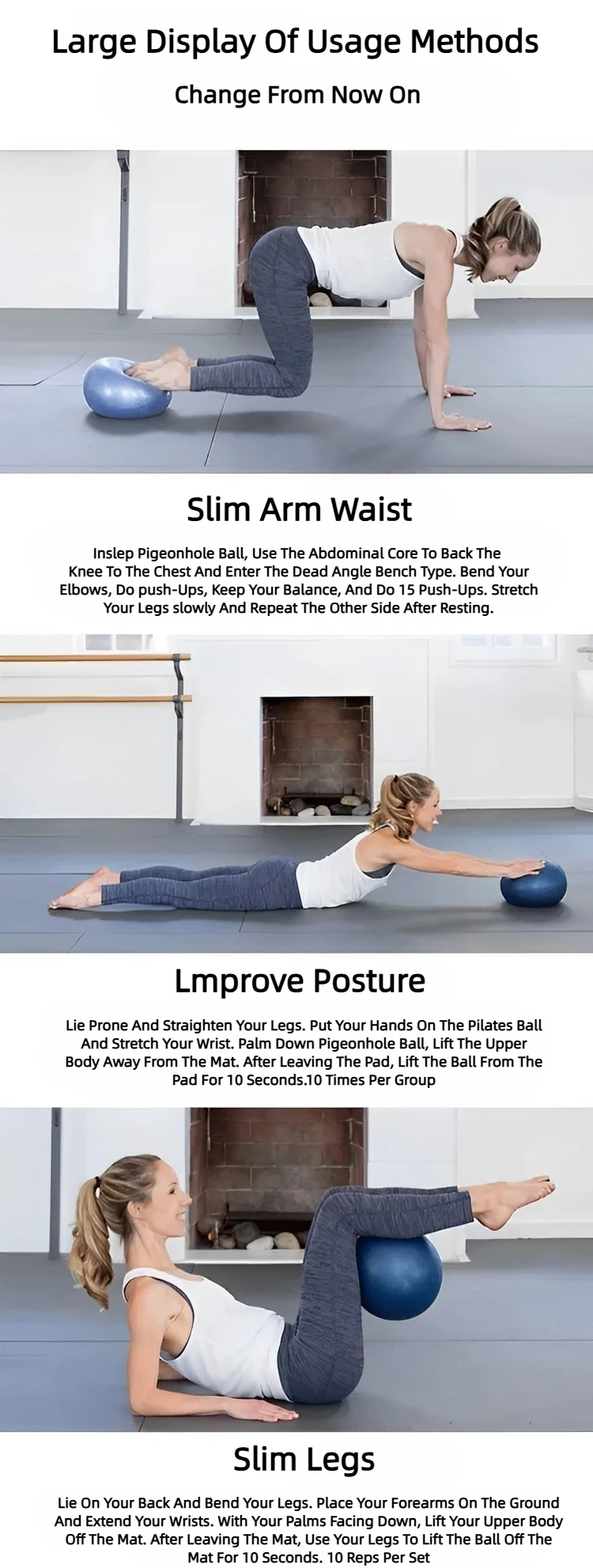 Lie Prone And Straighten Your Legs. Put Your Hands On The Pilates Ball And Stretch Your Wrist. Palm Down Pigeonhole Ball, Lift The Upper Body Away From The Mat. After Leaving The Pad, Lift The Ball From The Pad For 10 Seconds.10 Times Per Group