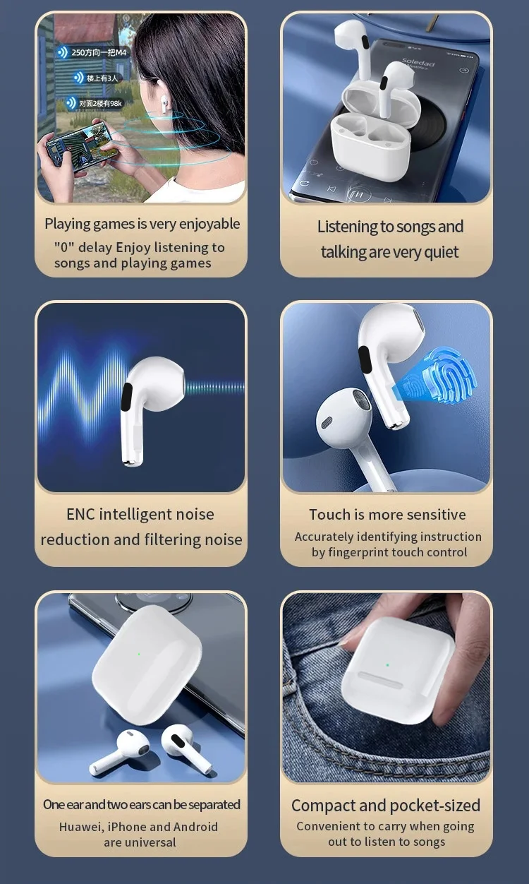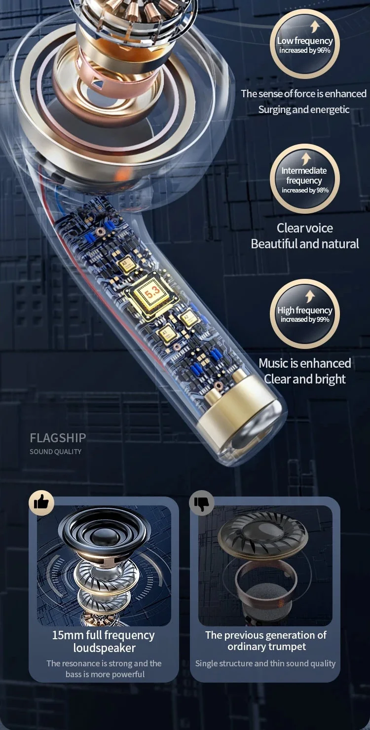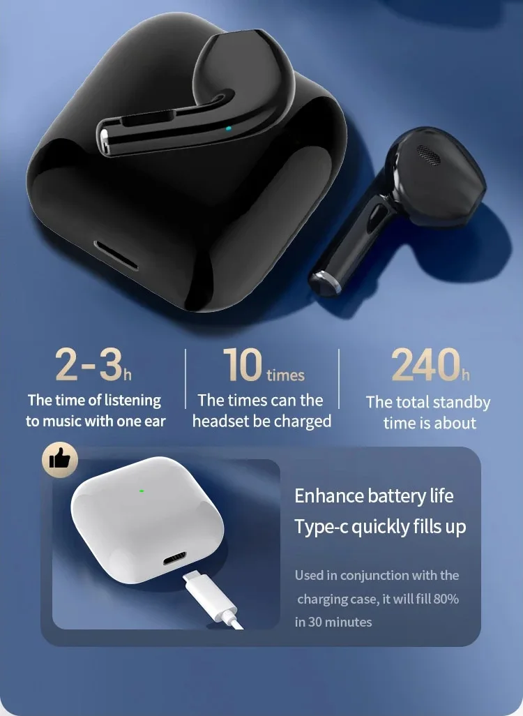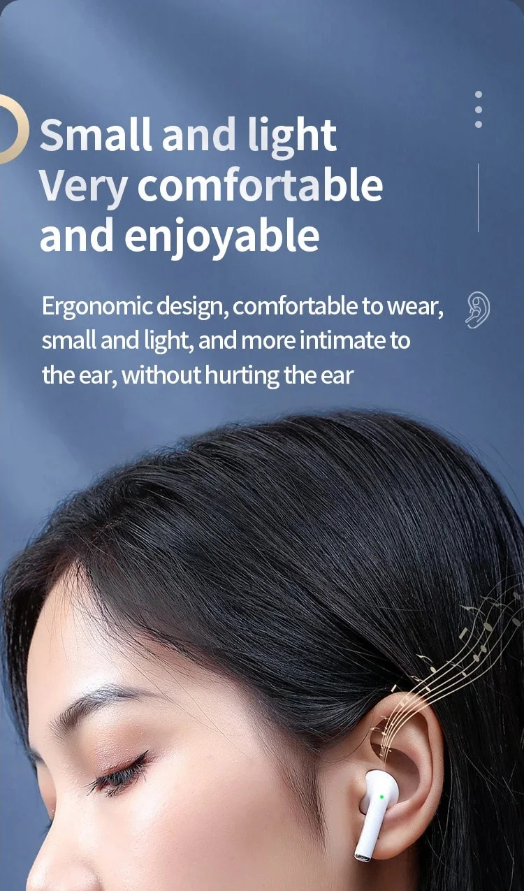 Main Feature:1. True wireless, binaural call,2. Digital battery display,3, Touch function4. Brass ring horn sound quality5. Low power6, breathing light